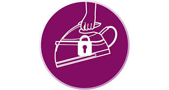 | Żelazko można zabezpieczyć, blokując je na podstawie Żelazko z generatorem pary jest wyposażone w zabezpieczenie na czas przenoszenia. Można bezpiecznie zablokować żelazko na podstawie, aby zmniejszyć ryzyko dotknięcia gorącej stopy. Można też bez problemu przenosić generator pary. |