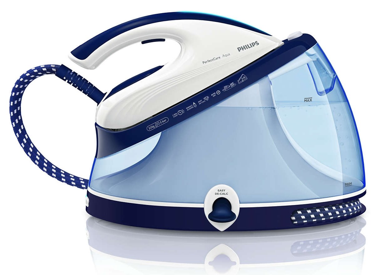 | Ciągły strumień pary do 120g/min, silne uderzenie pary 220 g Żelazko PerfectCare Aqua zapewnia mocny ciągły strumień pary do 120 g/min oraz silne uderzenie pary 220 g. Gwarantuje to doskonałe i szybkie rozprasowywanie zagnieceń oraz prasowanie w pionie |