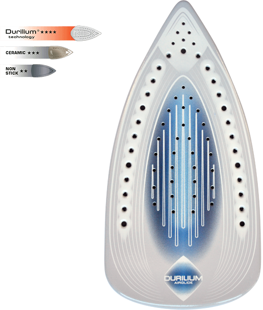 Powłoka stopy Durilium zapewnia łatwe prowadzenie po tkaninie oraz wytrzymałość - nie zniszczy jej kontakt z guzikami ani zamkami błyskawicznymi. Stopa żelazka posiada także funkcję Autoclean czyli samoczyszczenia - nie brudzi się z upływem czasu zapewniając zawsze łatwy ślizg i lekkie prasowanie.