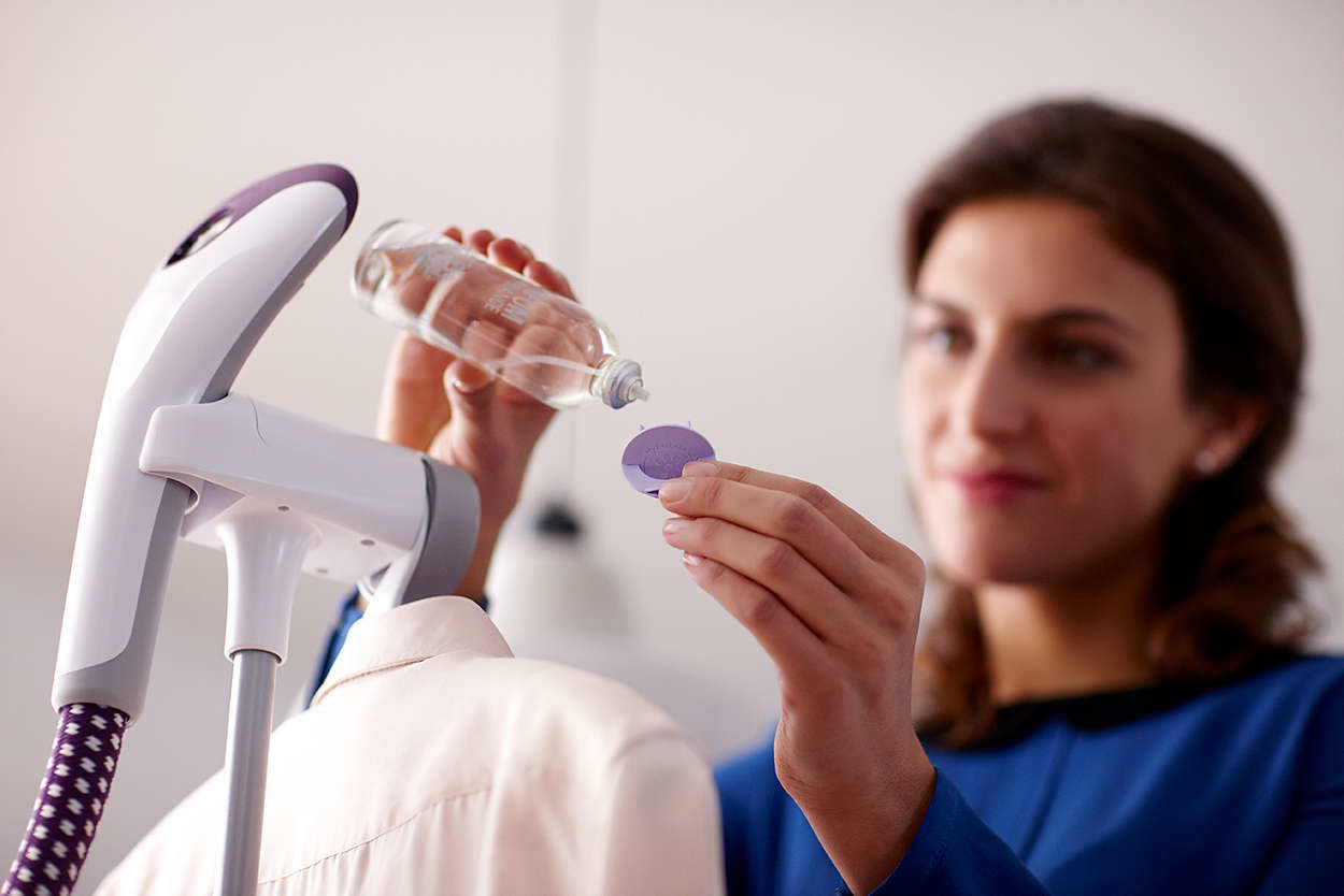 Para przenosi ulubiony zapach na ubrania Silny strumień pary nadaje ulubiony zapach ubraniom dzięki innowacyjnej nasadce zapachowej MyEssence. |