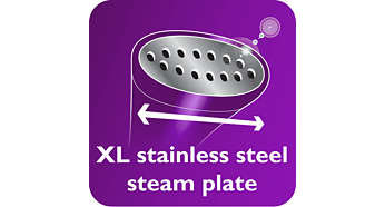 Płytka parowa XL ze stali szlachetnej zapewniająca szybsze efekty Steamer jest wyposażony w płytkę parową XL ze stali szlachetnej, która zapewnia szybsze efekty. |
