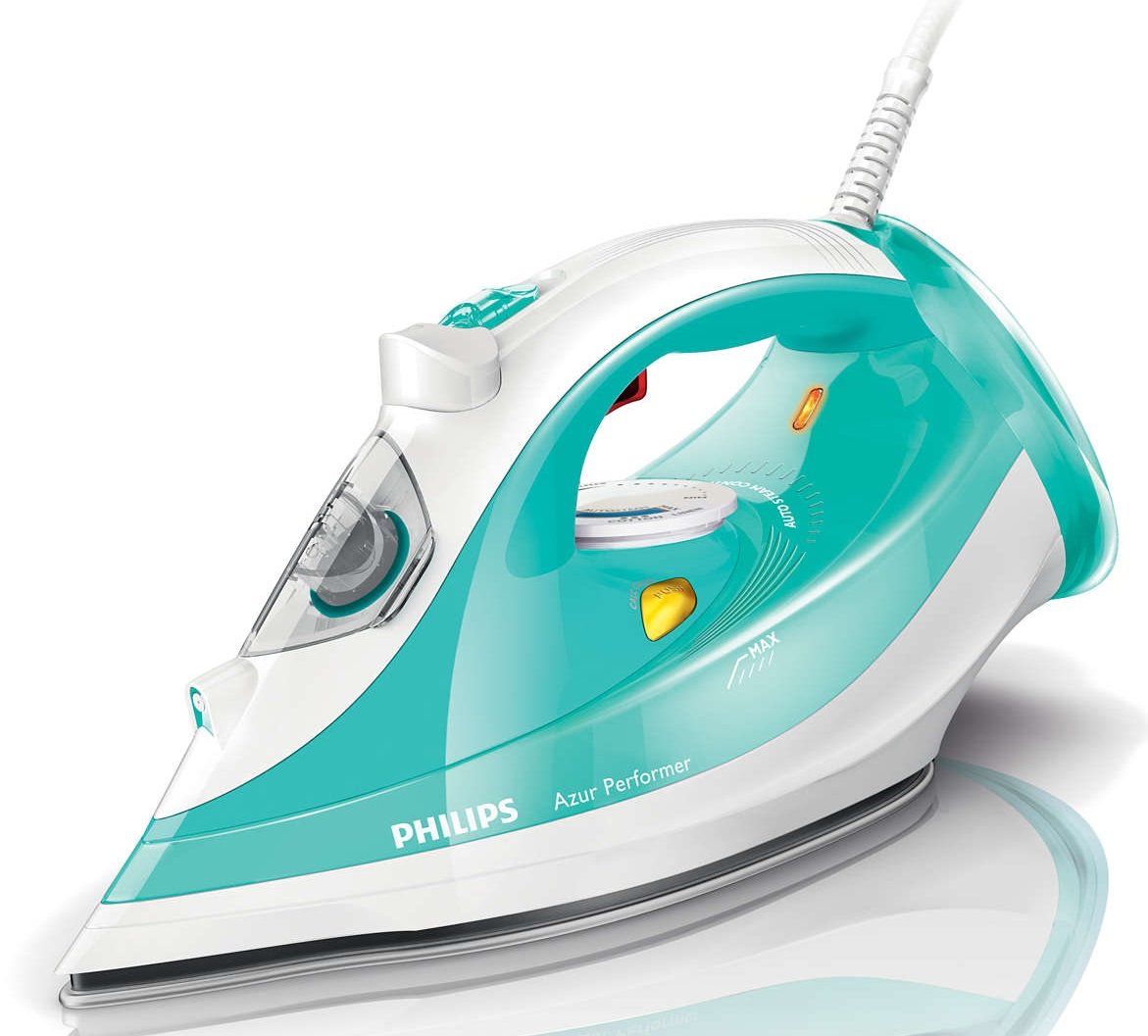 Moc 2400 W zapewniająca szybkie nagrzewanie się Dzięki mocy 2400 W żelazko parowe Azur Performer Plus szybko się nagrzewa i oferuje dużą wydajność, aby zapewnić doskonałe efekty prasowania. |