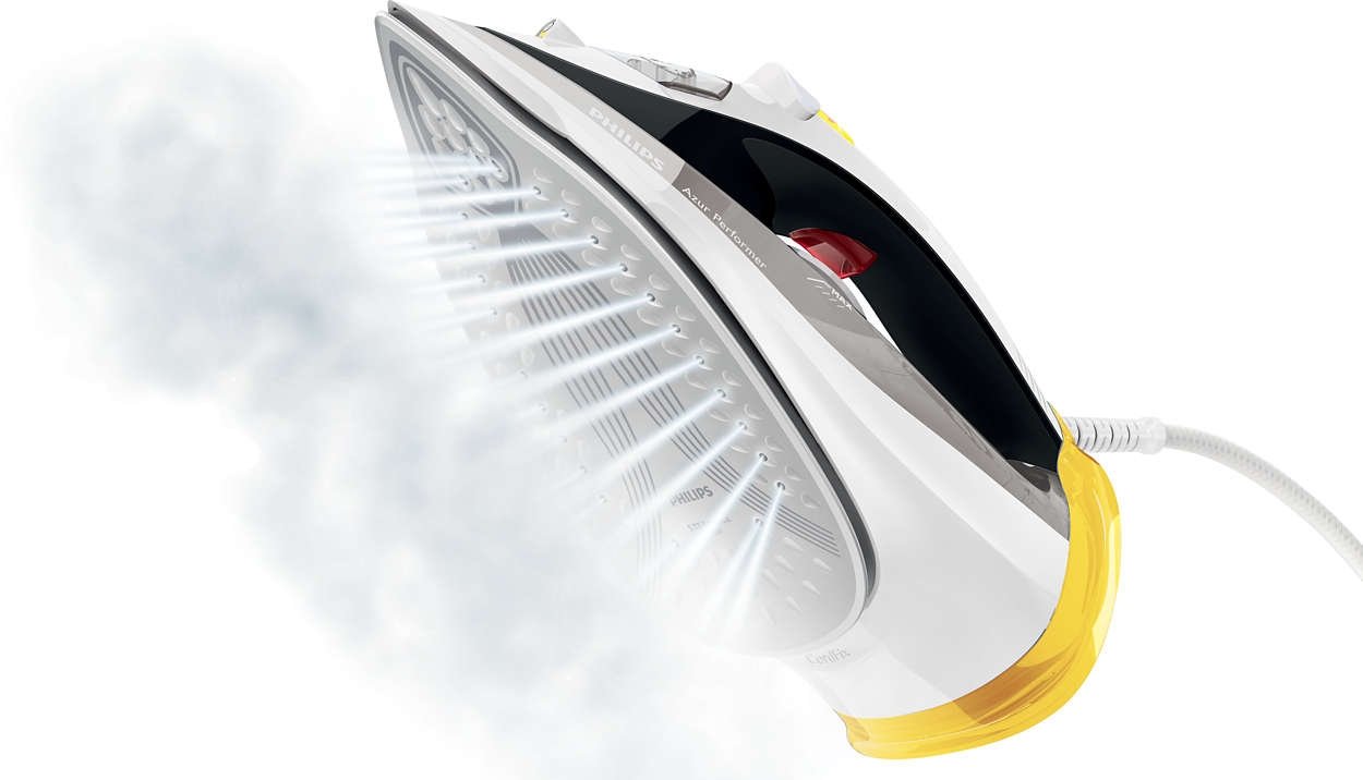 Moc 2400 W zapewniająca szybkie nagrzewanie się Dzięki mocy 2400 W żelazko parowe Azur Performer Plus szybko się nagrzewa i oferuje dużą wydajność, aby zapewnić doskonałe efekty prasowania. |