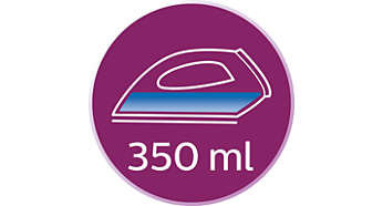 | Dzięki bardzo dużemu zbiornikowi (350 ml) wody starcza na dłużej Bardzo duży zbiornik wody o pojemności 350 ml umożliwia wyprasowanie większej ilości ubrań za jednym razem. |