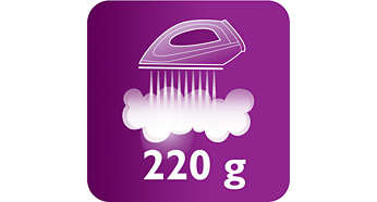 | Silne uderzenie pary do 220 g Funkcji silnego uderzenia pary można używać do prasowania w pionie i usuwania uporczywych zagnieceń. |