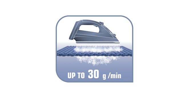 Wysoka moc sprawia, że stopa szybko się nagrzewa, a żelazko nieprzerwanie wytwarza dużą ilość pary. Żelazko jest gotowe do użycia w mgnieniu oka, co dodatkowo skraca czas prasowania.