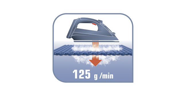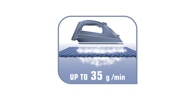 Wysoka moc sprawia, że stopa szybko się nagrzewa, a żelazko nieprzerwanie wytwarza dużą ilość pary. Żelazko jest gotowe do użycia w mgnieniu oka, co dodatkowo skraca czas prasowania.