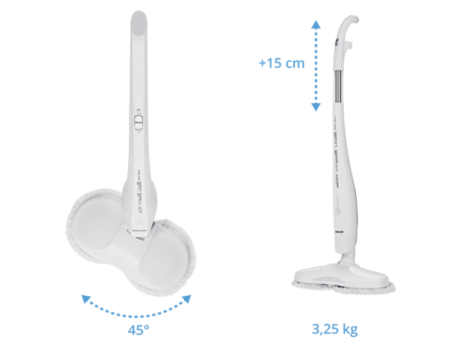 Połączenie szerokich mopów z najwyższej jakości mikrofibry z dużą mocą obrotową zapewnia największą efektywność sprzątania. Czyszczenie, bez konieczności szorowania, usunie nawet uciążliwe zabrudzenia. Wystarczą tylko 3 ruchy, aby umyć 1m², co jest niemożliwe przy tradycyjnym myciu podłóg.