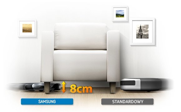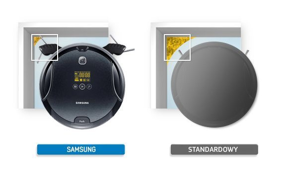 Czystość w każdym zakamarku W przeciwieństwie do tradycyjnych robotów sprzątających nowy odkurzacz-robot marki Samsung perfekcyjnie usuwa kurz w każdym zakamarku twojego mieszkania. Gdy NaviBot Corner Clean dociera do narożnika, wbudowane szczotki POP-OUT™ wysuwają się na około 85 mm – czyli dalej niż tradycyjne szczotki – aby dotrzeć tam, gdzie inne roboty sprzątające zawodzą. Sprzątanie w narożnikach nie wymaga zakładania żadnych nakładek, oszczędzając ci wysiłku. Odłóż miotłę i szufelkę. NaviBot Corner Clean kompleksowo zajmie się sprzątaniem. |