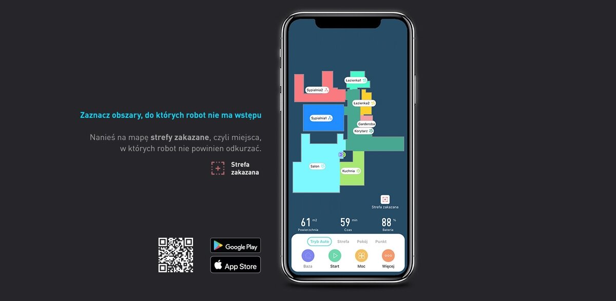 Zaplanuj pracę odkurzacza w najmniejszych szczegółach. Z pomocą aplikacji Tefal Xplorer zaznacz strefy No-Go, czyli miejsca do których robot nie będzie miał wstępu i ciesz się swobodą użytkowania.