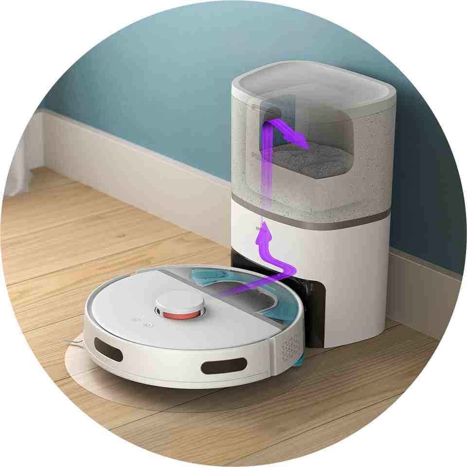 Robot automatycznie opróżni pojemnik na kurz po powrocie do stacji.