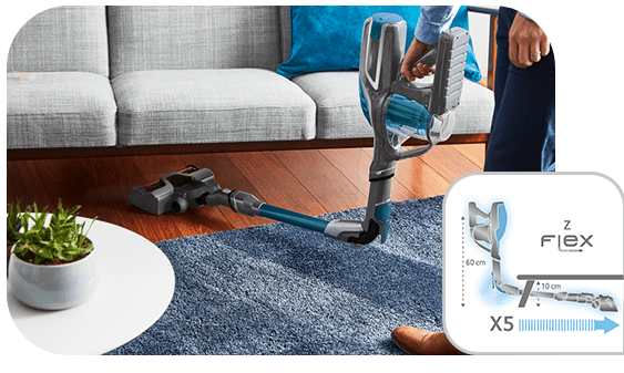 Z odkurzaczem bezprzewodowym z innowacyjną elastyczną rurą, dosięgniesz do kurzu pod niskimi meblami 5 razy skuteczniej! Technologia Flex łączy elastyczność z niezwykłą siłą ssania. Dotrzesz do każdego zakamarka Twojego domu, bez konieczności schylania się podczas odkurzania!