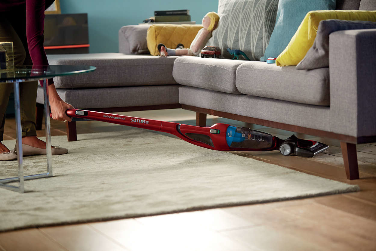 | Maksymalna swoboda manewrowania umożliwia odkurzanie trudno dostępnych miejsc Odkurzacz PowerPro Duo pozwala dotrzeć do wszystkich zakamarków — umożliwia łatwe odkurzanie przestrzeni pod kanapą, łóżkiem czy stołem. |