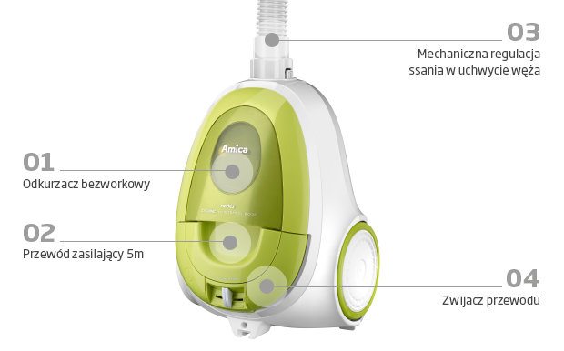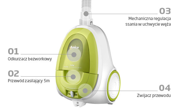 Jesteś jedną z osób, które nie lubią ograniczeń, także w trakcie sprzątania? Koniecznie wypróbuj odkurzacz cyklonowy Amica, który będzie dla Ciebie idealnym rozwiązaniem! Został on wyposażony w specjalny pojemnik, który zastępuje worki tradycyjne. Po jego zapełnieniu wystarczy, że wysypiesz zawartość do kosza na śmieci.