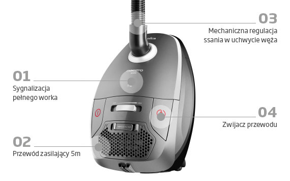 | Funkcje: | Regulacja mocy ssania, Turboszczotka, Zwijacz przewodu |
