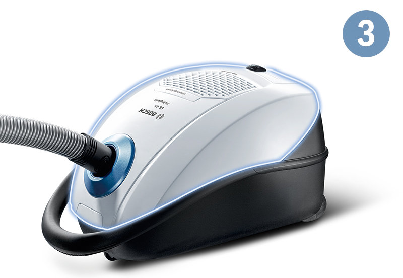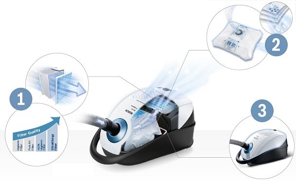 Dzięki najlepszej technologii filtracji marki Bosch powietrze wydmuchiwane z odkurzacza jest czystsze niż powietrze w odkurzanym pomieszczeniu. Zatrzymuje wszelkie zanieczyszczenia. Zastosowany w odkurzaczu filtr UltraAllergy jest filtrem zmywalnym, co oznacza mniejsze koszty eksploatacji. Równie sprawnie działa worek filtrujący z wielowarstwową włókniną filtracyjną, zatrzymującą prawie wszystkie cząstki zanieczyszczeń i kurzu.