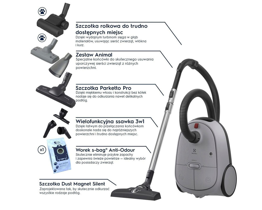 | Funkcje: | Regulacja mocy ssania, Zwijacz przewodu |