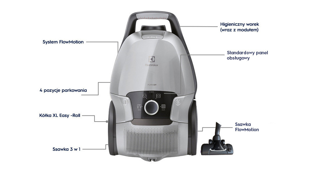 System FlowMotion Pozwala na płynne i łatwe manewrowanie odkurzaczem. Dzięki kółkom XL Easy-Roll oraz ssawce z kółkami na łożyskach kulkowych można łatwo kierować odkurzaczem unikając uderzeń o przeszkody.