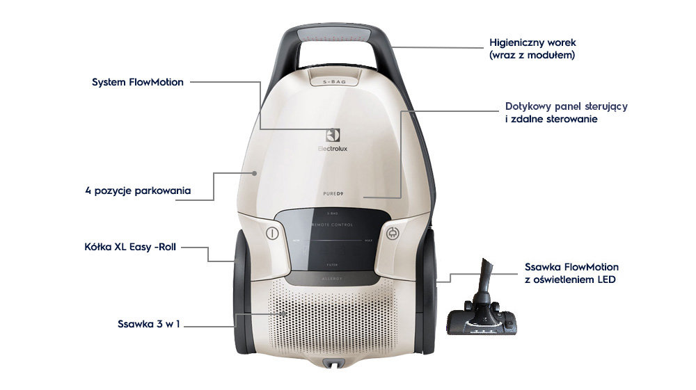 | Funkcje: | Regulacja mocy ssania, Zwijacz przewodu |