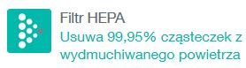 Filtr HEPA usuwa 99,95% cząsteczek z wydmuchiwanego powietrza z odkurzacza w trakcie sprzątania, włączając w to pyłki i wydzieliny roztoczy. Powietrze, które jest zassane przez odkurzacz przechodzi przed powrotem przez filtr HEPA gdzie wszystkie zanieczyszczenia pozostają nie szkodząc nam już więcej. |