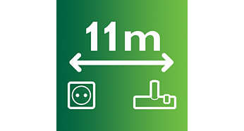 Daleki zasięg umożliwia wygodne sprzątanie Zasięg 11 m umożliwia czyszczenie większych powierzchni bez konieczności przełączania wtyczki. |