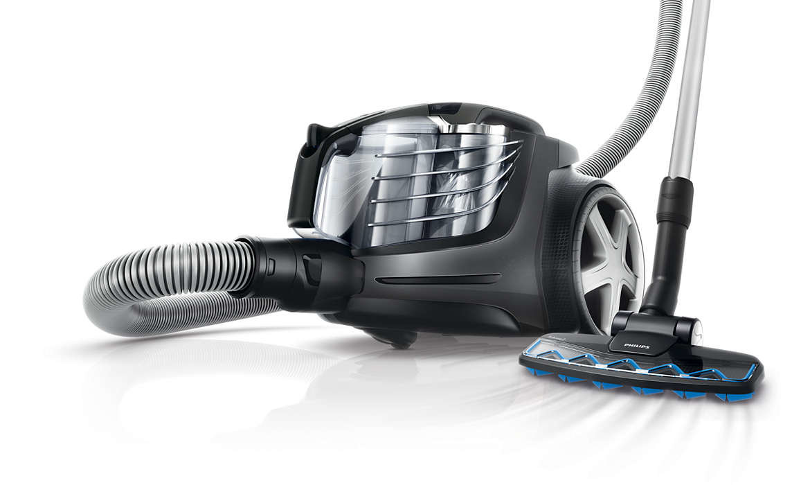 Technologia PowerCyclone 7 zapewnia wyjątkową moc ssania Aerodynamiczny kształt odkurzacza z technologią PowerCyclone 7 minimalizuje opór powietrza i zapewnia wyjątkowo efektywne odkurzanie w trzech niezwykle skutecznych krokach: 1) Powietrze szybko wpływa do komory PowerCyclone dzięki prostemu i gładkiemu wlotowi. 2) Zakrzywiony przepust powietrza przyspiesza jego ruch w górę komory cyklonicznej. 3) U góry komory cyklonicznej łopatki wentylujące skutecznie oddzielają kurz od powietrza. |