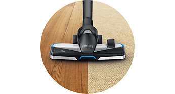 | Nasadka TriActive+ umożliwia sprzątanie na 3 sposoby Nasza wyjątkowa nasadka TriActive+ delikatnie „otwiera” dywan w celu dokładnego oczyszczenia. Kanały powietrzne z przodu i po bokach wsysają okruchy i zbierają brud wzdłuż mebli i ścian. |
