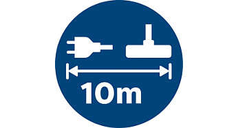 Przewód o długości 10 m umożliwia odkurzanie w bardziej oddalonych miejscach bez przełączania wtyczki Dzięki zasięgowi 10 m od wtyczki do nasadki odkurzacz umożliwia dłuższe odkurzanie bez przełączania wtyczki. |