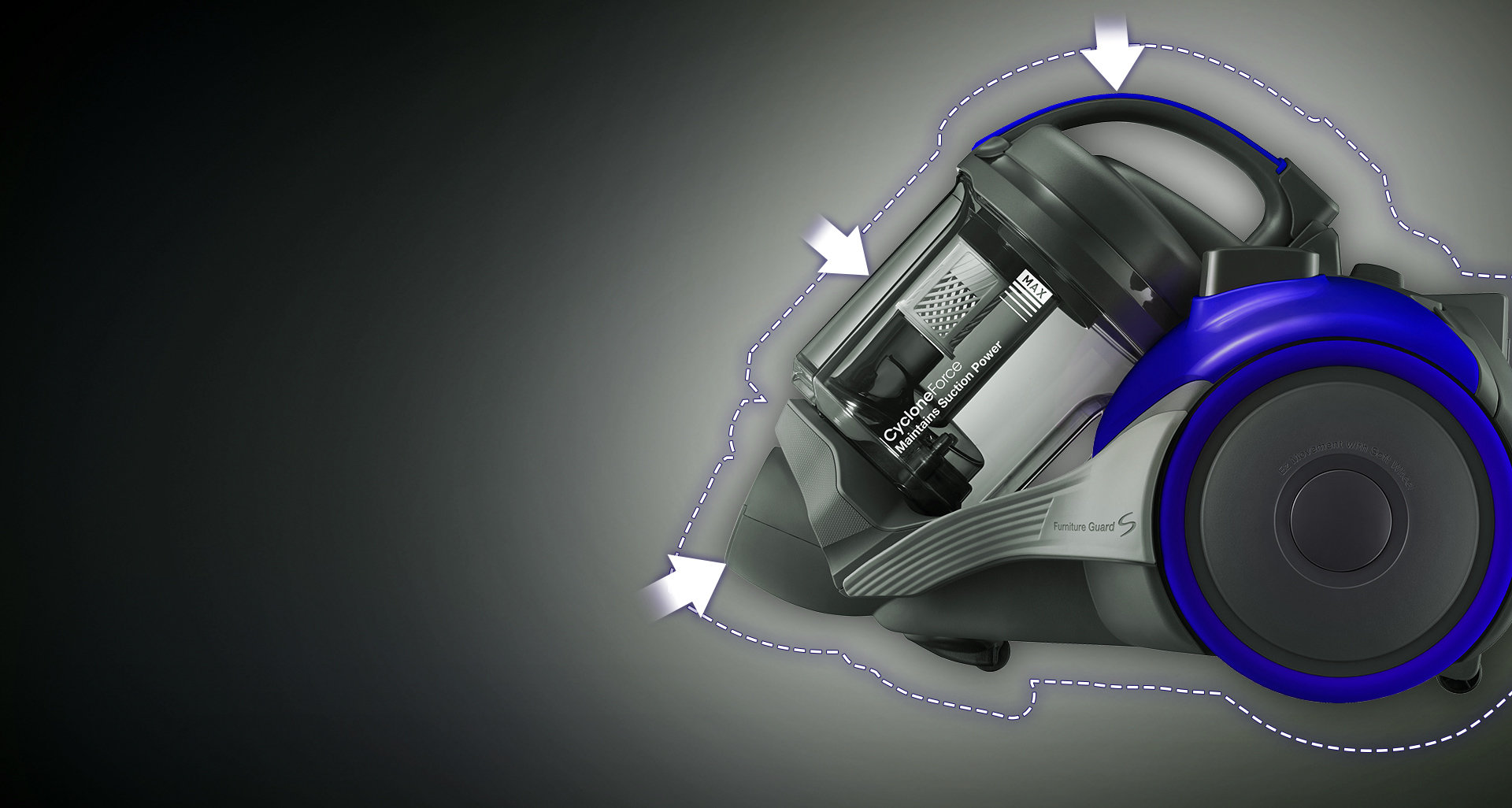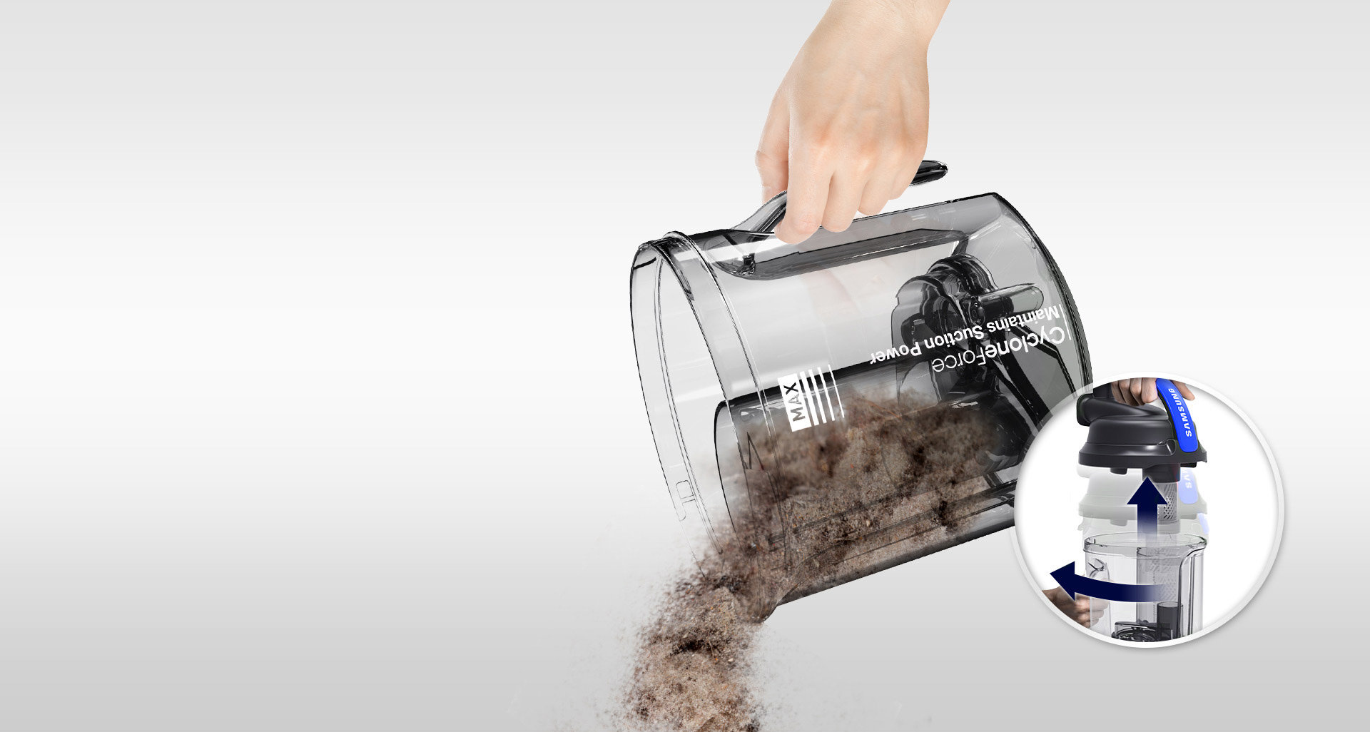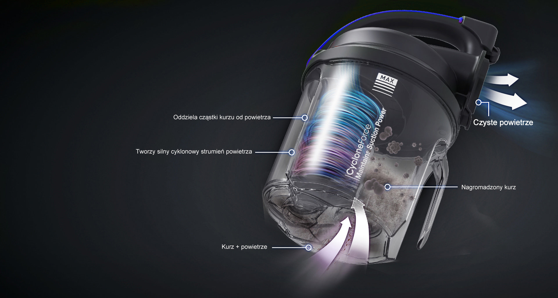 Wysoka moc ssąca na dłużej* Siła odśrodkowa wytwarzana przez technologię CycloneForce przenosi zabrudzenia do zewnętrznego pojemnika na kurz. W ten sposób filtr nie zapycha się, a odkurzacz zachowuje wysoką moc ssącą na dłużej. |