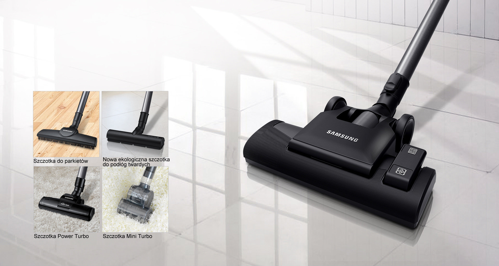 Odkurzacz posiada szeroki wybór akcesoriów, które znacznie ułatwiają skuteczne sprzątanie. Szczotki Parquet Master i nowa Eco Hard Floor przystosowane są do twardych powierzchni. Power Pet z kolei jest idealna do odkurzania sierści, a Mini Turbo sprawdzi się na dywanach i w ciasnych obszarach. Odkurzacz wykonano z lekkich materiałów, dzięki czemu sprzątanie za jego pomocą jest wygodne i przyjemne. Waży tylko 4,6 kg i jest o 16% mniejszy od tradycyjnych modeli odkurzaczy Samsung. |