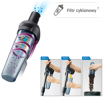 Unikalny filtr cyklonowy wbudowany w odkurzacz Samsung oddziela duże cząsteczki kurzu za pomocą siły odśrodkowej. Jest on umieszczony w rączce, dzięki czemu łatwo sprawdzisz ilość zebranych zanieczyszczeń. Dzięki temu w worku zbierane są wyłącznie drobne cząsteczki kurzu, a to sprawia, że siła ssąca pozostaje stała i nie wymaga czyszczenia przez dwukrotnie dłuższy okres w porównaniu z tradycyjnymi systemami Samsung.