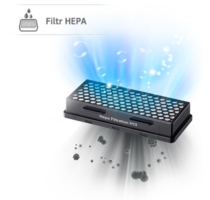 Filtracja HEPA W odkurzaczach Samsung zastosowano filtrację HEPA, gwarantującą najwyższą czystość powietrza wydmuchiwanego podczas odkurzania. Dzięki wyłapywaniu mikrocząsteczek kurzu i innych alergenów, jak np. pyłków kwiatowych i pleśni, filtracja HEPA sprawiają, że środowisko, w którym przebywamy, jest czystsze i zdrowsze. |
