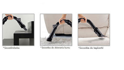 W przypadku trudno dostępnych miejsc można skorzystać z zestawu akcesoriów 3 w 1 z końcówkami o różnym kształcie: szczelinówka, szczotka do zbierania kurzu oraz szczotka do tapicerki.