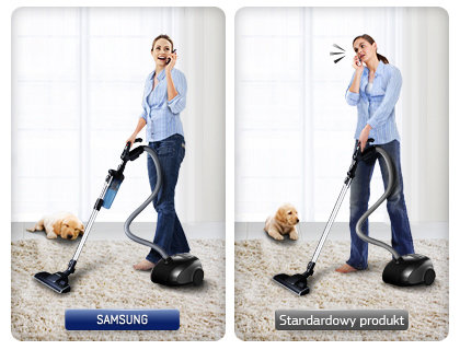 Wyjątkowo cicha praca Nadmierny hałas nie będzie już więcej problemem. Specjalna konstrukcja odkurzacza Samsung sprawia, że pracuje on niezwykle cicho. |