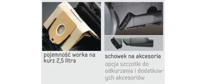 Worek na kurz ma pojemność aż 2,5 l, poza tym dostępny jest schowek na akcesoria.
