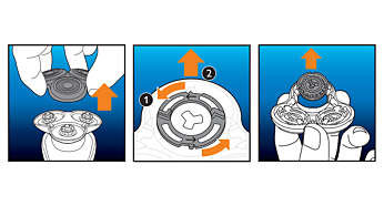 | Łatwa wymiana głowic 1. Zdejmij uchwyt głowicy golącej. 2. Umieść uchwyt pierścienia zabezpieczającego na pierścieniu zabezpieczającym, obróć go w lewo i zdejmij z głowicy golącej. 3. Wymień głowice golące na nowe. 4. Umieść pierścień zabezpieczający na głowicy golącej, korzystając z uchwytu, a następnie obróć go w prawo, aby ponownie go przymocować. 5. Załóż ponownie uchwyt głowicy golącej. 6. Aby zresetować golarkę, naciśnij i przytrzymaj wyłącznik przez ponad 5 sekund. |