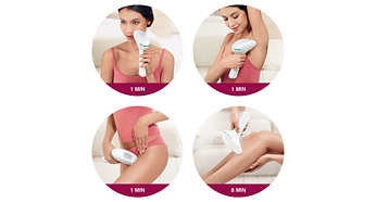| Ciesz się beztrosko gładką skórą!* -Do stosowania na twarzy i ciele -Zabieg na dolnych partiach nóg: 15 min - > 250 000 błysków światła -Działanie bezprzewodowe |