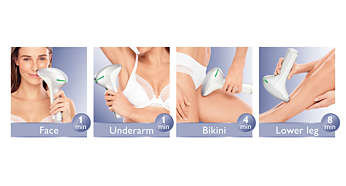 | Bezpieczne i skuteczne działanie, nawet w przypadku wrażliwej skóry Urządzenia można bez obaw używać do usuwania owłosienia z obszarów poniżej linii szyi: nóg, pach, okolic bikini, ramion czy brzucha. |