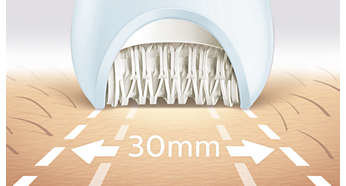 Bardzo szeroka głowica depilatora depiluje większą powierzchnię skóry przy każdym ruchu, co zapewnia szybsze usuwanie włosków.