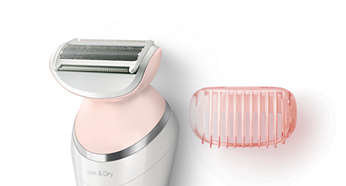 Nasadki do twarzy i miejsc wrażliwych umożliwiają usunięcie niechcianego owłosienia Łagodniejszą depilację różnych obszarów ciała zapewnia nasadka do twarzy, która usuwa niechciane owłosienie, oraz nasadka do miejsc wrażliwych, która usuwa włosy pod pachami i w okolicy bikini. |