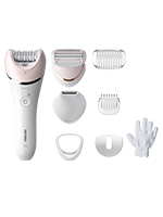 | Wyposażenie: | 1 x głowica depilująca do pach/okolic bikini, 1 x głowica goląca, 1 x nasadka do miejsc wrażliwych, 1 x nasadka do przycinania, 1 x pokrowiec, 1 x rękawica peelingująca, 1 x szczoteczka do czyszczenia |