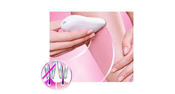 Delikatne dyski depilujące usuwają włoski bez pociągania za skórę Depilator jest wyposażony w delikatne dyski depilujące, które usuwają włoski bez pociągania za skórę. |