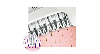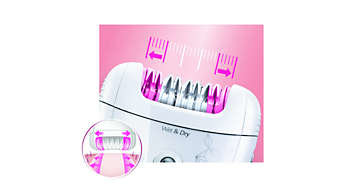 | Szeroka głowica depilująca pokrywa większą powierzchnię skóry jednym ruchem Nasza bardzo szeroka głowica depilująca pozwala usunąć maksymalną ilość włosków za każdym pociągnięciem, zapewniając długotrwałe rezultaty i niezwykłą gładkość w zaledwie kilka minut. |