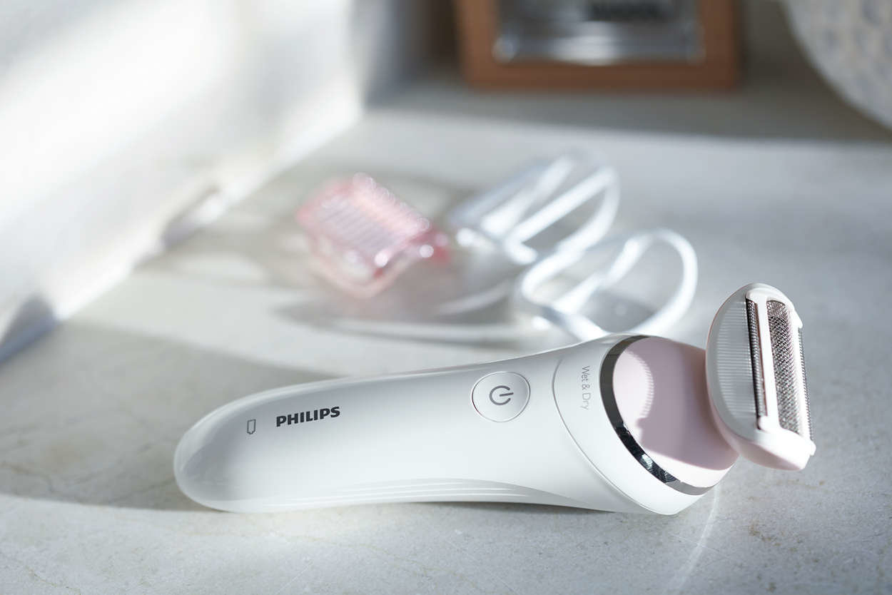 Ergonomiczny uchwyt umożliwia wygodne golenie Ergonomiczny, zakrzywiony uchwyt umożliwia łatwe manewrowanie, zapewniając pełną kontrolę i większy zasięg. Możesz w naturalny i precyzyjny sposób przesuwać urządzenie po całym ciele. |