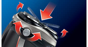 | Pivot, Flex & Float Głowice dopasowują się, aby przez cały czas przylegać do skóry, i obracają się, aby uzyskać dodatkowy wymiar ruchu. Zapewnia to dokładne, szybkie i wygodne golenie. |