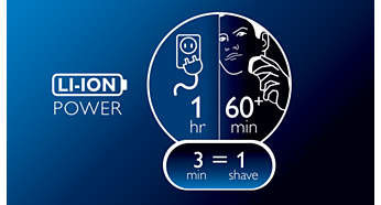 | Około 60 minut działania po 1 godzinie ładowania Energooszczędny, wydajny i trwały akumulator litowo-jonowy zapewnia więcej cykli golenia po każdym ładowaniu. Godzinne ładowanie daje blisko 60 minut pracy, co wystarcza na 20 cykli golenia. Golarka automatycznie dostosowuje moc do sposobu golenia, przez co rzeczywisty czas golenia może różnić się od podanego. Trzyminutowe ładowanie wystarczy na jedno golenie. |