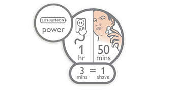 50 minut działania po 1 godzinie ładowania Energooszczędny i wydajny akumulator litowo-jonowy zapewnia więcej cykli golenia po jednym ładowaniu. Godzinne ładowanie pozwala nawet na 50 minut pracy. Trzyminutowe ładowanie wystarczy na jedno golenie. |
