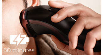 | Godzina ładowania wystarcza na około 50 minut bezprzewodowego golenia Otrzymasz blisko 50 minut czasu pracy — to około 17 cykli golenia — po jednogodzinnym ładowaniu. Możesz także wybrać golenie podłączonym urządzeniem. |