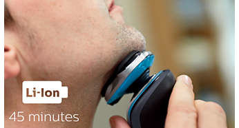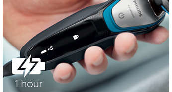 Czas ładowania: 1 godz. Dłuższe golenie po każdym ładowaniu dzięki wydajnemu, efektywnemu i trwałemu akumulatorowi litowo-jonowemu. Szybkie ładowanie przez 5 minut zapewnia wystarczającą ilość energii na jeden cykl golenia. |