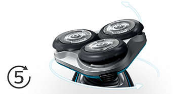 | Głowice poruszają się w 5 kierunkach, zapewniając szybkie i dokładne golenie 5-kierunkowe głowice o 5 niezależnych ruchach gwarantują bliski kontakt ze skórą w celu zapewnienia szybkiego i dokładnego golenia nawet na linii szyi i szczęki. |